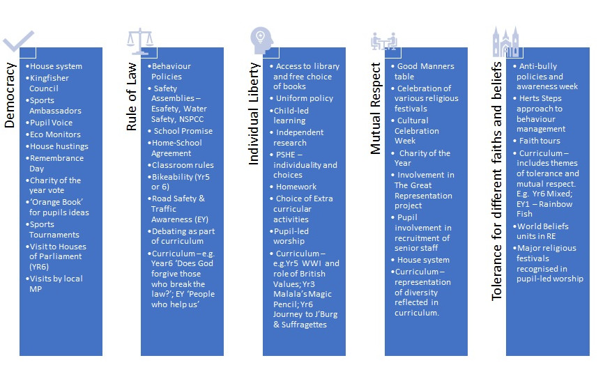At Broxbourne Primary, we ensure British Values are woven through our curriculum and lived through the ethos of the school.  All Curriculum areas are provided as a vehicle for furthering understanding of these concepts: in particular Religious Education (RE), History, Personal, Social, Health and Economics (PSHE) and English.